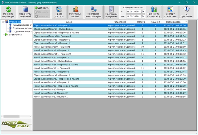 Программа «HostCall - Nurse Statistics» предназначена для сбора статистики вызовов пациентов из палат со всех отделений больницы. Данное программное обеспечение работает с преобразователями интерфейсов MP-251W4 в системе палатной сигнализации «HostCall CMP». На каждое отделение устанавливается один преобразователь интерфейса MP-251W4.