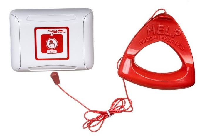 Вызов можно осуществить 2 способами – либо дернув за шнур, либо нажав мембранную клавишу на лицевой панели кнопки. На лицевой панели радиокнопки имеется светодиод, который обеспечивает индикацию посылки вызова и разряда батареи. Вызов дублируется подсветкой, встроенной в корпус кнопки, и звуковым сигналом. Радиокнопка вызова MP-413W2 имеет влагозащищенное исполнение IP44.