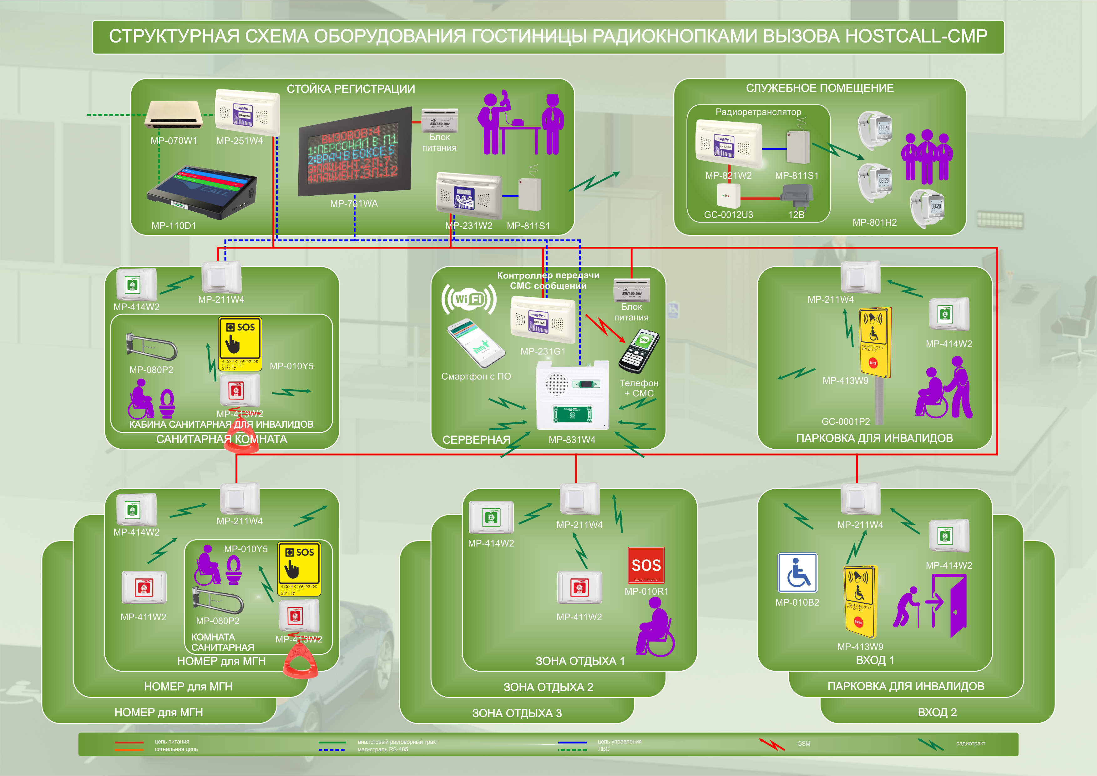 Основное назначение системы: вызов и привлечение внимания обслуживающего персонала (горничной, охраны) в случае необходимости уборки номера или оказания помощи гостям и посетителям гостиницы. Данная модификация системы имеет полностью аналогичный функционал системы HOstCAll-CMP без разговорного тракта, а главным преимуществом беспроводной радиоканальной системы является отсутствие необходимости прокладывать кабельные линии между устройствами, что ускоряет монтаж системы. Согласно ГОСТ Р 52131-2019, рядом со входом на объект с открытым доступом населения устанавливается табличка MP-010B2 "Знак доступности объекта для инвалидов, передвигающихся на креслах-колясках". Табличка MP-010Y4 "Знак кнопка вызова персонала" размещается над кнопкой вызова персонала, которая устанавливается перед входом в здания и сооружения общественного назначения, а также в местах отдыха и ожидания инвалидов, в туалетах над кнопками вызова размещается табличка с пиктограммой «Знак кнопка вызова экстренной помощи» MP-010Y5. Таблички "Знак туалет для инвалидов-колясочников"(MP-010B4) и "Знак направление движения" (MP-010B5) совместно размещаются на путях движения инвалидов в креслах-колясках для обозначения направления движения к туалету доступному для инвалидов на креслах-колясках. Рядом с входом в блок общественных туалетов, в составе которых имеется туалет для инвалидов, совместно устанавливаются таблички MP-010Y6" Знак блок общественных туалетов" и MP-010B2 "Знак доступности для инвалидов-колясочников". Рядом со входом в отдельную туалетную кабину, оборудованную для инвалидов на креслах-колясках размещается табличка MP-010Y7 "Знак туалет доступный для инвалидов". Рядом со входом в лифт, который соответствует нормативным требованиям, предъявляемым к лифтам для инвалидов на креслах-колясках, устанавливается табличка MP-010B3 "Знак обозначения лифта, доступного для инвалидов на креслах-колясках "(ГОСТ Р 52131-2019). На основании СП 59.13330.2020 "Доступность зданий и сооружений для маломобильных групп населения" СНиП 35-01-2001 универсальные кабины и другие санитарно-бытовые помещения, предназначенные для пользования всеми категориями граждан, в том числе инвалидами, следует оборудовать стационарными MP-080P1 и откидными опорными поручнями MP-080P2(MP-080P3). На рисунке ниже приведены примеры оснащения разных помещений необходимым оборудованием.